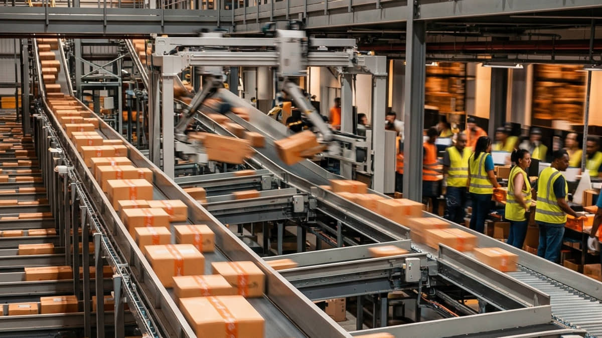 Robôs e humanos trabalham em centro de distribuição de ponta da Shopee - Imagem conceitual gerada por IA/Diário do LitoralO foco agora é o que eles chamam de "última milha". Eles espalharam mais de 3 mil pontinhos de coleta por aí (sabe aquela papelaria ou lojinha de bairro?).