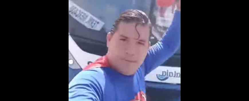 Vestido com o uniforme do Super-Homem, Andrade andava no meio da rua com um microfone quando foi surpreendido por um ônibus pelas costas
