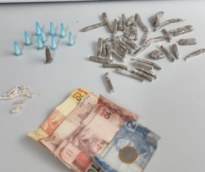 Foi então realizada a abordagem, momento em que os indivíduos se evadiram do local, sendo que os policiais deteram o suspeito na posse de 10 porções de cocaína (21.39g), 41 porções de maconha (69.22g) e 8 pedras de crack (9g), além de valores em dinheiro.