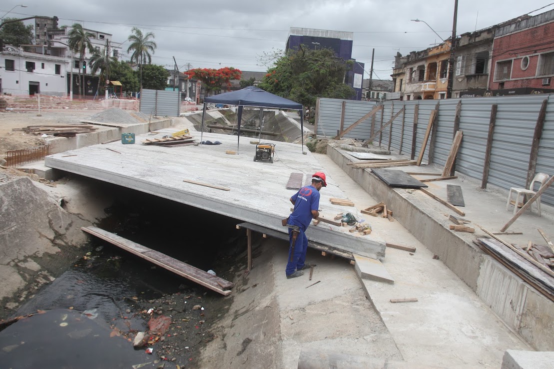 Nesta etapa, estão sendo instaladas dez lajes de 11,95m que formarão o novo pontilhão. Sobre elas será aplicada uma camada de concreto armado de 10cm. Na sequência, o trecho receberá o pavimento asfáltico. Serão executados calçadas periféricas e guarda-corpo padrão Santos. O pontilhão terá, ainda, novas rampas de acessibilidade e uma reforma na infraestrutura viária no entorno. Além disso, também serão realizados limpeza, pintura e reparos pontuais em parte das muretas e taludes em alvenaria do canal.
