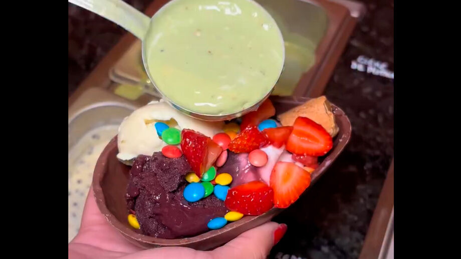 Uma novidade diferente para a Páscoa está chamando atenção em Santos. Uma sorveteria da cidade lançou um self service de sorvete e açaà servido dentro de um ovo de Páscoa, permitindo que o cliente monte a sobremesa do jeito que quiser.