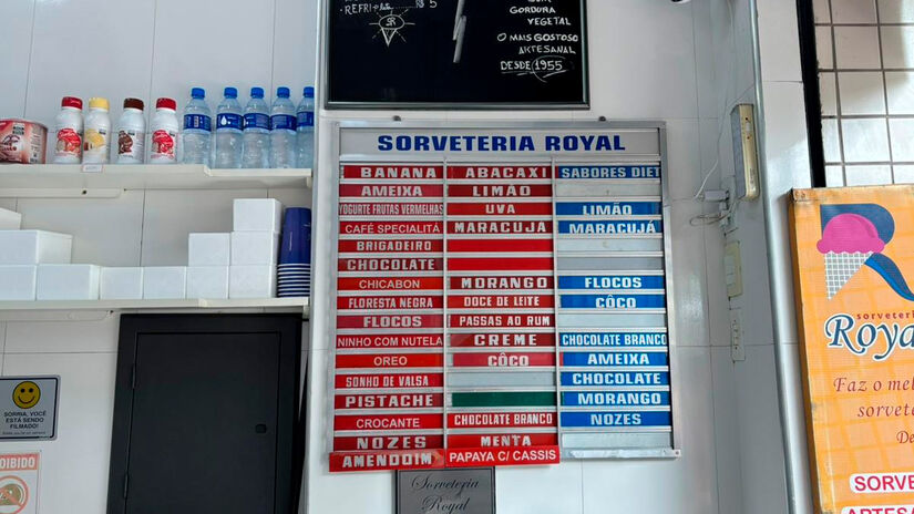 Tudo ali é feito na própria sorveteria: são 30 sabores normais e 10 sabores diet, sem açúcar. Há também opções à base de água, sem leite, como limão, abacaxi, maracujá, cupuaçu, uva e açaí, atraindo quem busca alternativas mais leves.