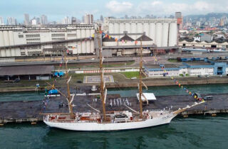 A embarcação ficará no Cais da Marinha, no Porto de Santos, até o dia 27, reforçando a histórica ligação da cidade com o mar