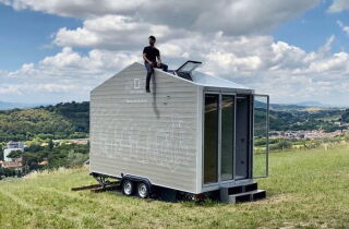 Construída em madeira, a casa foi projetada para ser móvel, autônoma e completa, acompanhando o morador em deslocamentos pela Europa