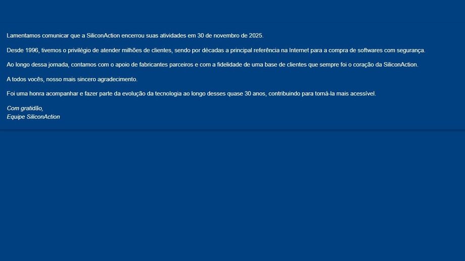 Em 2025, quase trinta anos depois da fundação, veio o anúncio de despedida: a SiliconAction encerrou as atividades em 30 de novembro, agradecendo a parceria de fabricantes e clientes e lembrando que, por décadas, tinha sido referência em compra de software com segurança.