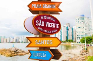 O totem com as placas das cidades reafirma São Vicente como eixo central da Região Metropolitana da Baixada Santista, destacando tanto sua relevância histórica