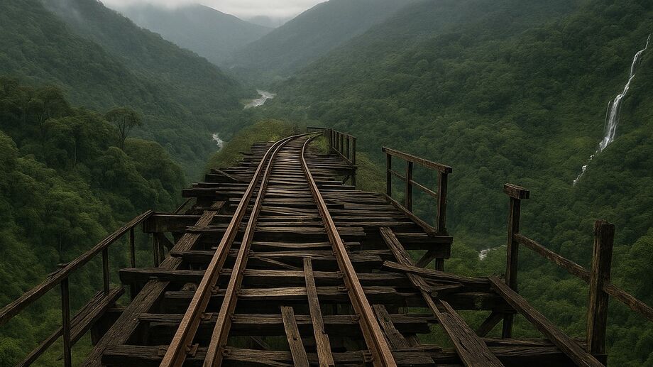 Os riscos são concretos e não se restringem ao crime ambiental. O traçado passa por túneis escuros, trechos em ruína e pontes com vãos abertos e dormentes podres, muitas vezes a dezenas de metros do chão, sem qualquer equipamento de segurança.