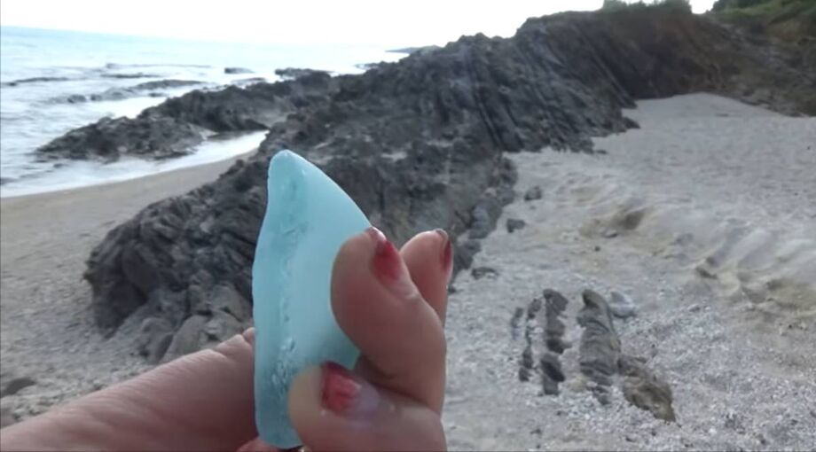 Com o tempo, a ação das ondas e da areia arredonda suas bordas e torna a superfície fosca, criando o efeito característico.