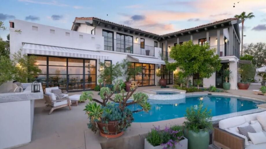 Na área externa, uma piscina de formato livre, spa transbordante, churrasqueira, lounge com lareira, garagens duplas e até um estúdio para gravações independentes completam o espaço.