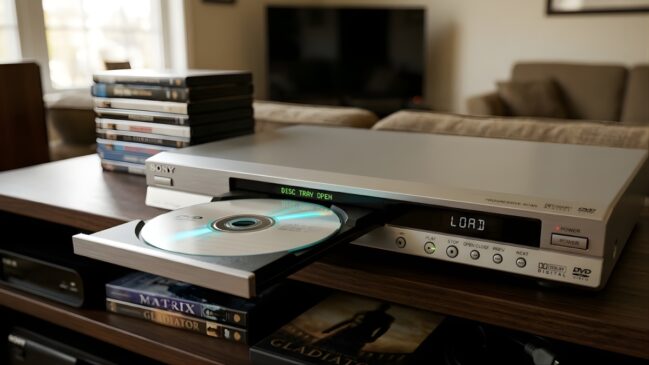 Ainda é possível encontrar aparelhos de DVDs e filmes do formato vendidos no mercado (Imagem Gerada por IA/Google Gemini)