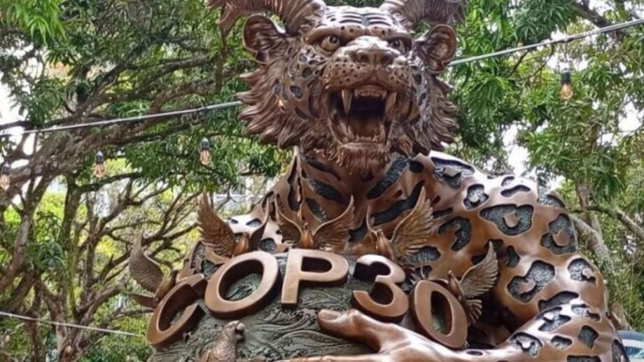 A escultura intitulada "Espírito Guardião Dragão Onça", presenteada pela China por ocasião da COP30, representa uma criatura híbrida com chifres e dentes proeminentes, que sustenta um globo terrestre com a inscrição da conferência climática.